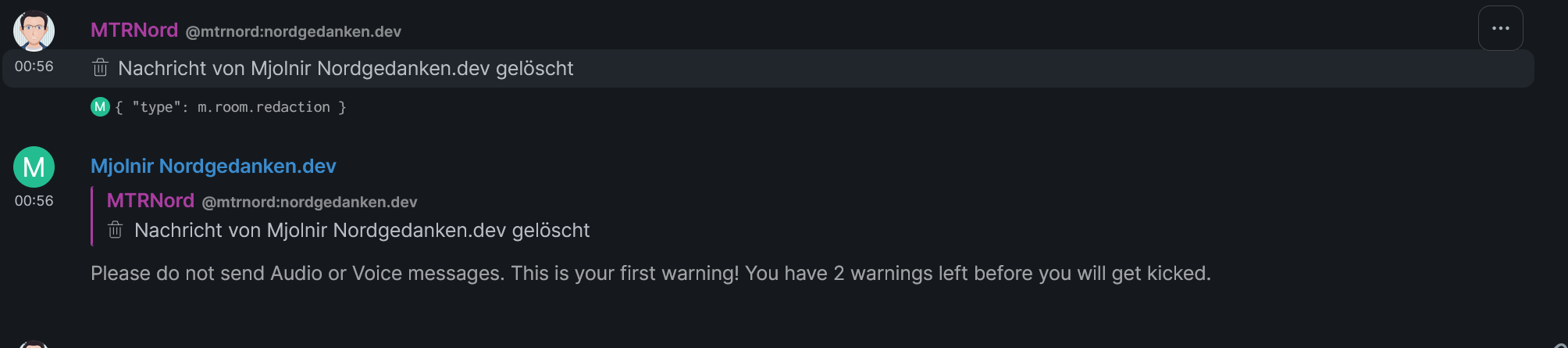- Note that KT doesn't allow deleting a message if it's too old, so Matrix->KT redactions will fail for old messages.
