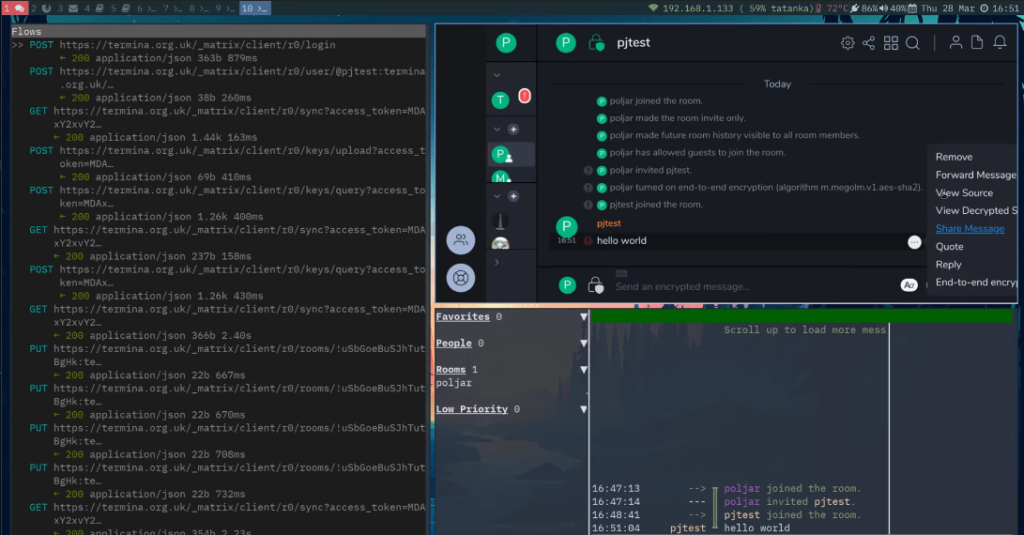 Since we haven't featured their work here at all I wanted to give some space to poljar. They've been working on a Weechat-Matrix protocol script, but as part of this project they created a new Matrix client library, matrix-nio, "designed according to sans I/O principles".