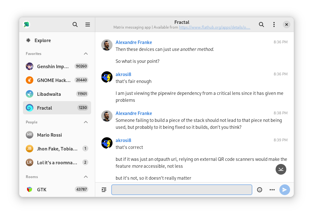 This week we tagged Fractal as 5.alpha1. This is our first release since Fractal has been rewritten to take advantage of GTK 4 and the Matrix Rust SDK. It is the result of eighteen months of work. Currently supported features are: